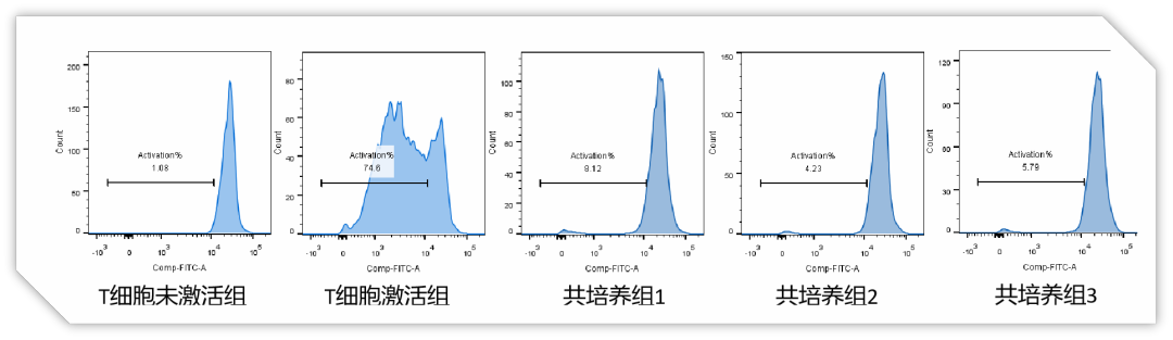 免疫调节能力检测(其中一项):TD-MSC SF Media培养的脐带间充质干细胞培养至P6代,将检测细胞与激活的外周血单个核细胞进行共培养,检测干细胞对T细胞的增殖抑制率,显示检测的干细胞保持对T细胞高效的增殖抑制能力,抑制率高达90%。