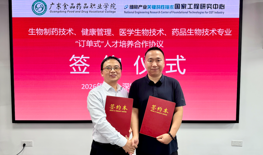 来源:产业创新人才培养中心 建设单位:个体化细胞治疗技术国家地方联合工程实验室(深圳) 时间:2026-02-03 1 月 29 日,深圳南山智园暖意融融,一场见证校企合作深度升级的签约仪式在此圆满举行。广东食品药品职业学院(以下简称“广食药”)健康管理与生物技术学院与细胞产业关键共性技术国家工程研究中心(以下简称“细胞产业国家工程中心”)正式签订 “订单式” 人才培养协议,聚焦生物制药技术、健康管理、医学 […]